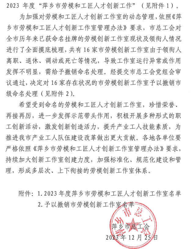 2023年度萍鄉(xiāng)市勞模和工匠人才創(chuàng)新工作室
